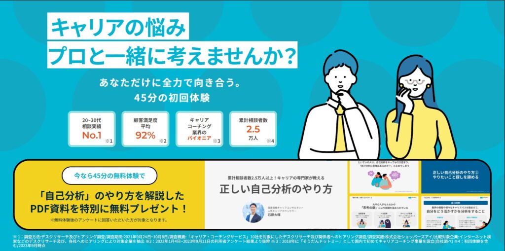 しかし、自己分析、キャリア設計、行動計画、チャットサポートなど、キャリアに向き合うための支援が用意されています。